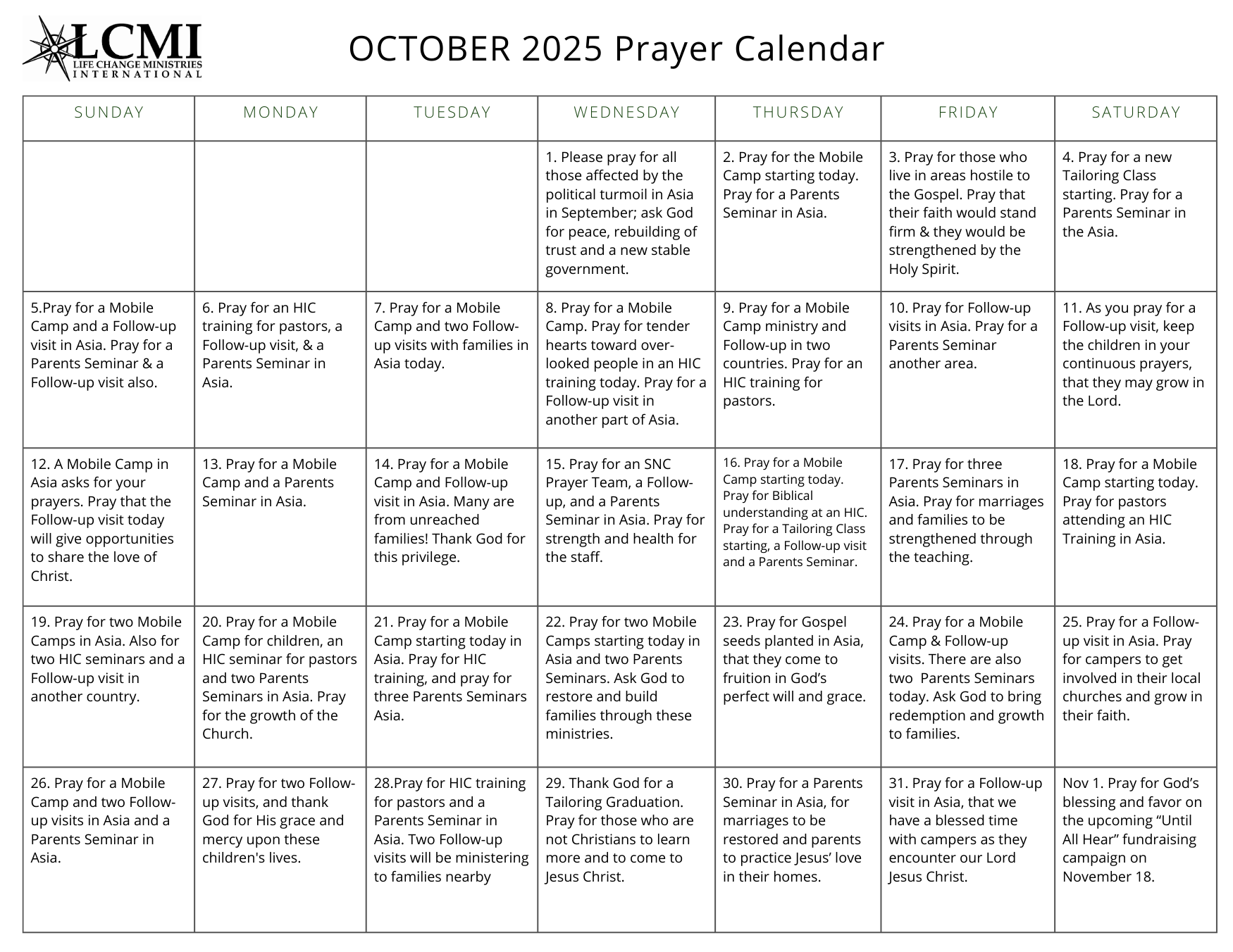 Prayer is absolutely essential for our ministry, and we ask earnestly for you to pray for LCMI. Please click here to find out how you can be a blessing through prayer.